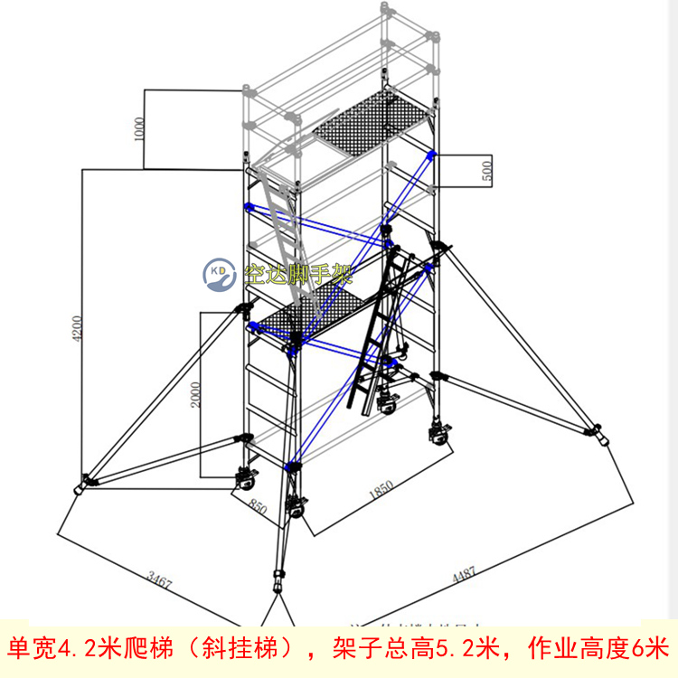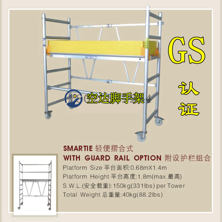 空达GF50系列单宽度铝脚手架的尺寸1.8米长,0.83米宽,每层高度2米或者1.5米,围栏1米高,高度可根据作业需求叠加